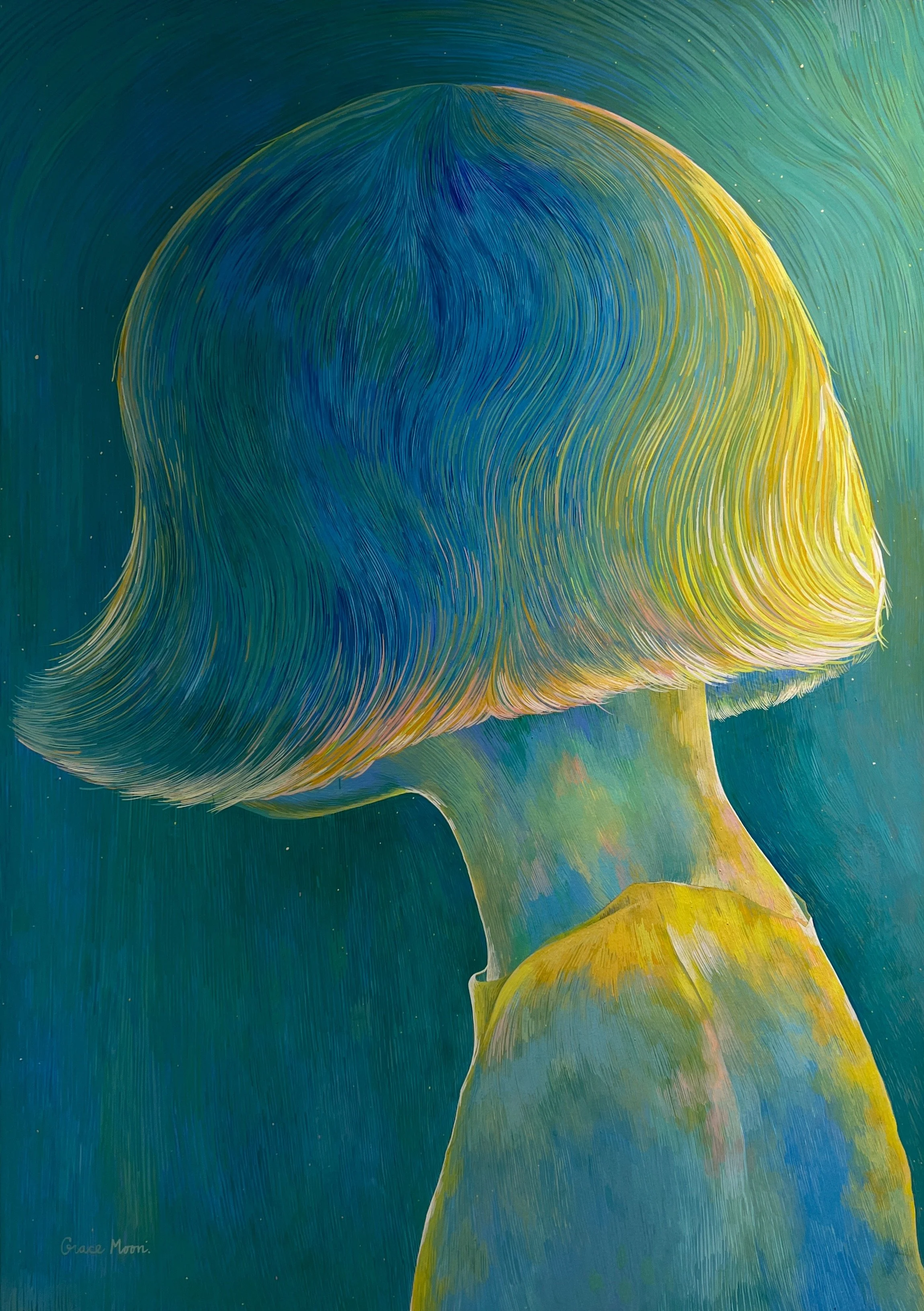 그레이스 문은 서울에서 활동하는 건축가이자 작가이며 그녀는 1996년 서울, 대한민국에서 태어났습니다. 하지만 그녀는 샌프란시스코, 미국에서도 어린 시절을 보냈습니다. 그런 점에서 작가는 미술에 뛰어난 이해도를 가지고 있으며, 동서양의 문화와 예술을 적절히 섞어 작품에 이야기를 잘 풀어내고 있습니다. 그녀의 작품에는 화려하고 색상이 다채로운 작은 점들과 다양한 매개체를 이용해 작품을 만든다는 큰 특징이 있습니다. 따라서, 그레이스 문의 작품에는 눈에 띄고 다채로운 색상의 공존을 볼 수 있으며 이로 인해 그녀의 작품을 감상한 사람들에게 강렬한 인상을 심어주고 있습니다. 작가의 작품들 중에는 파블로 피카소로부터 영감을 받은 (점) 시리즈가 있으며, 그녀는 다양한 매개체를 이용해 수상 생물을 표현한 Deux (되) 시리즈 또한 매우 흥미롭게 볼 수 있습니다. 이 시리즈의 작품들을 볼 때면 실물과 매우 흡사한듯한 물고기 한 쌍이 물을 노니는 모습을 볼 수 있는데 아크릴 물감을 사용한 작품 외에도 많은 잡지를 이용해 콜라주 작품으로 만든 물고기들을 볼 수 있습니다. 물고기의 비늘을 화려한 색상의 종이를 붙여 생동감을 불어넣었으며 드로잉과 콜라주 기법을 통해 매우 사실적인 작품을 표현하였습니다. 그레이스 문의 작품을 보는 사람으로 하여금 그녀의 그림들은 분명히 관객들의 눈을 사로잡는 화려한 작품이지만 따뜻한 감정을 느낄 수 있는 특별한 매력이 있습니다.